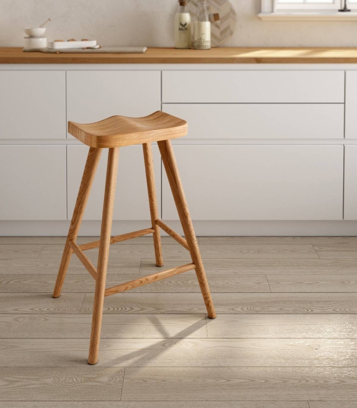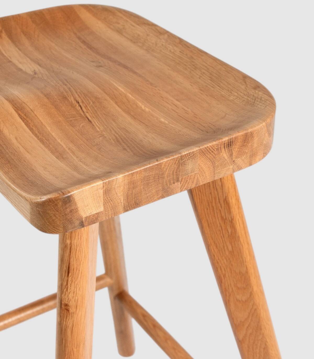 El taburete Junco de comedor se compone de asiento y cuatro patas de madera de color roble natural.