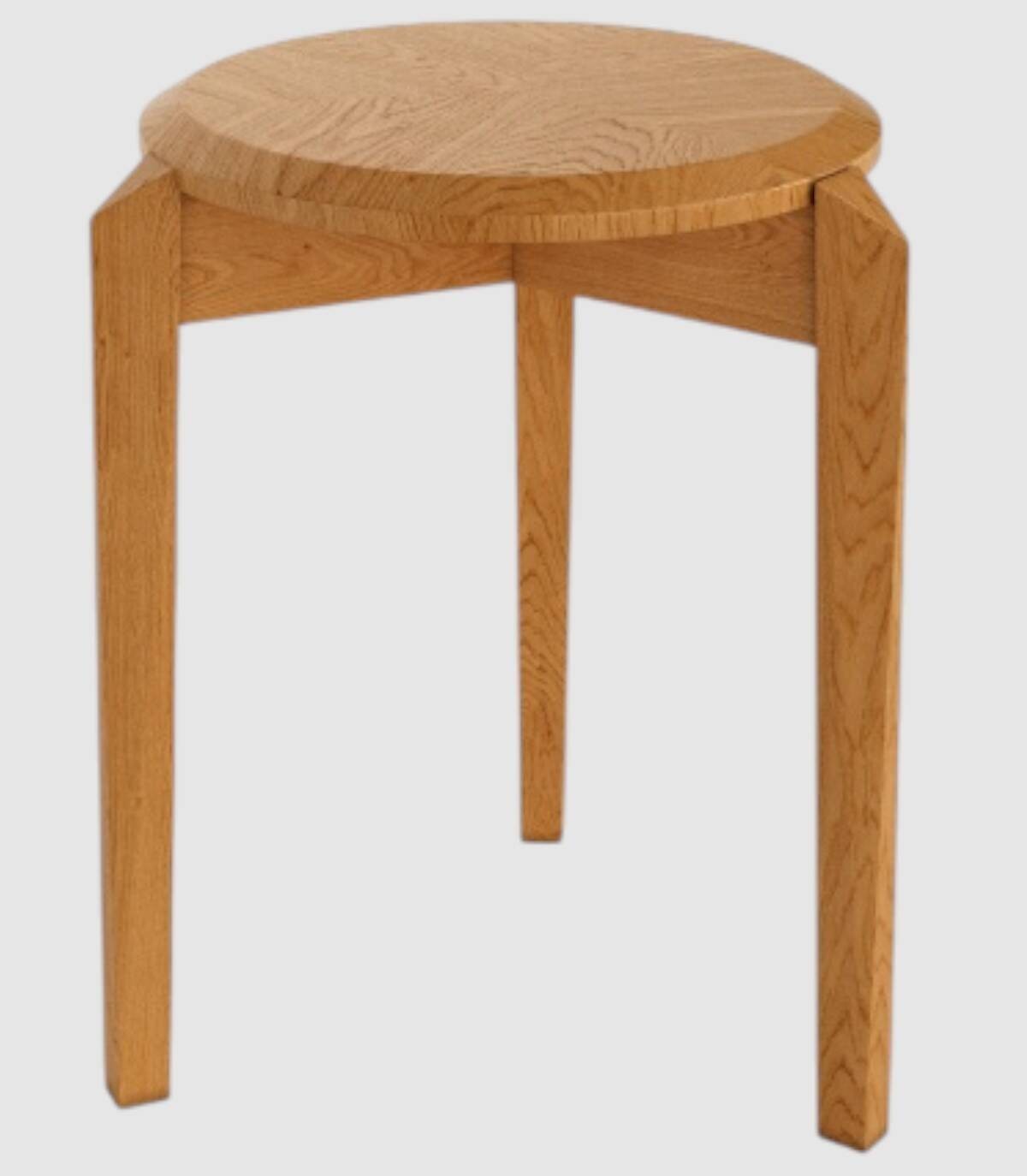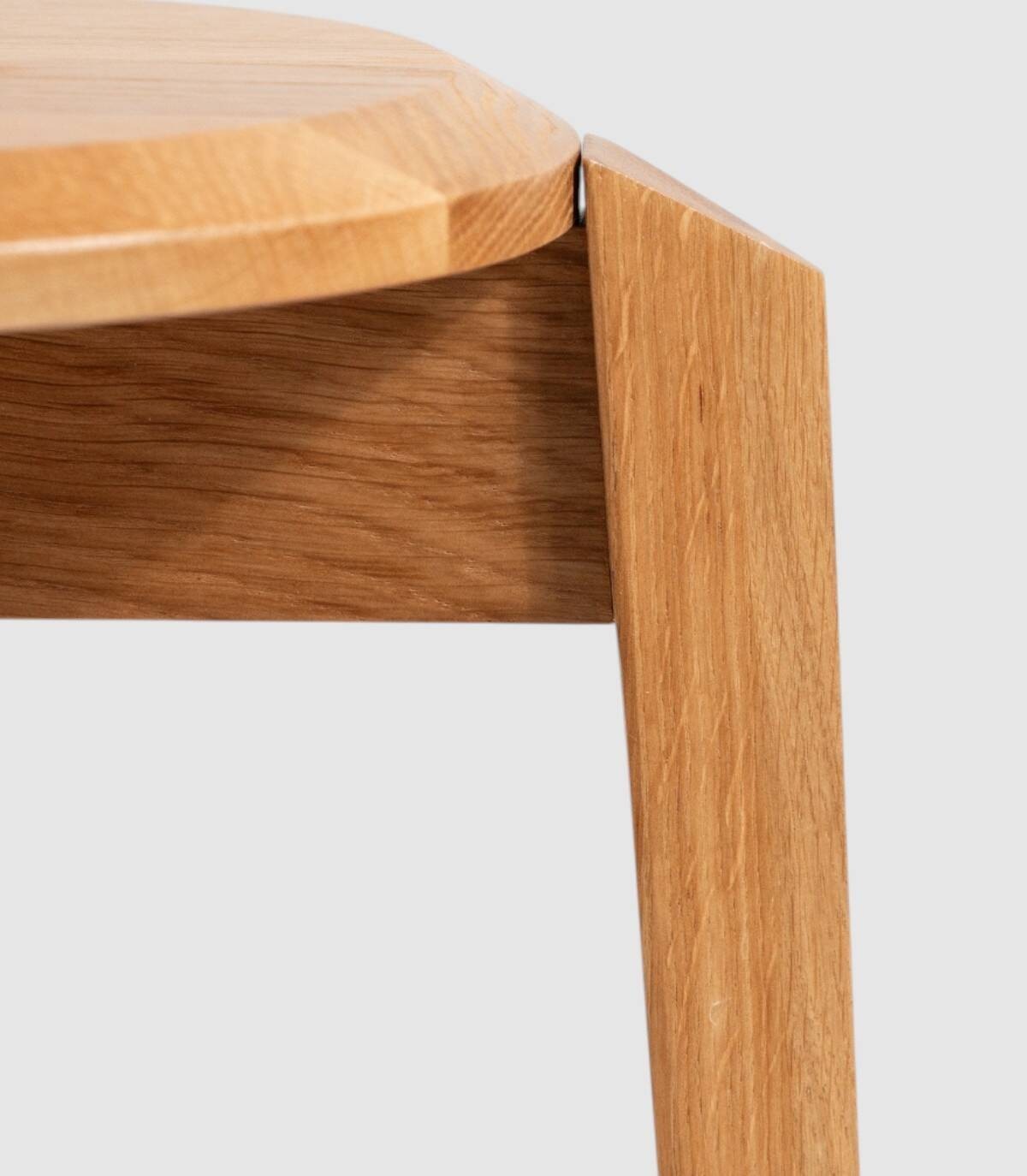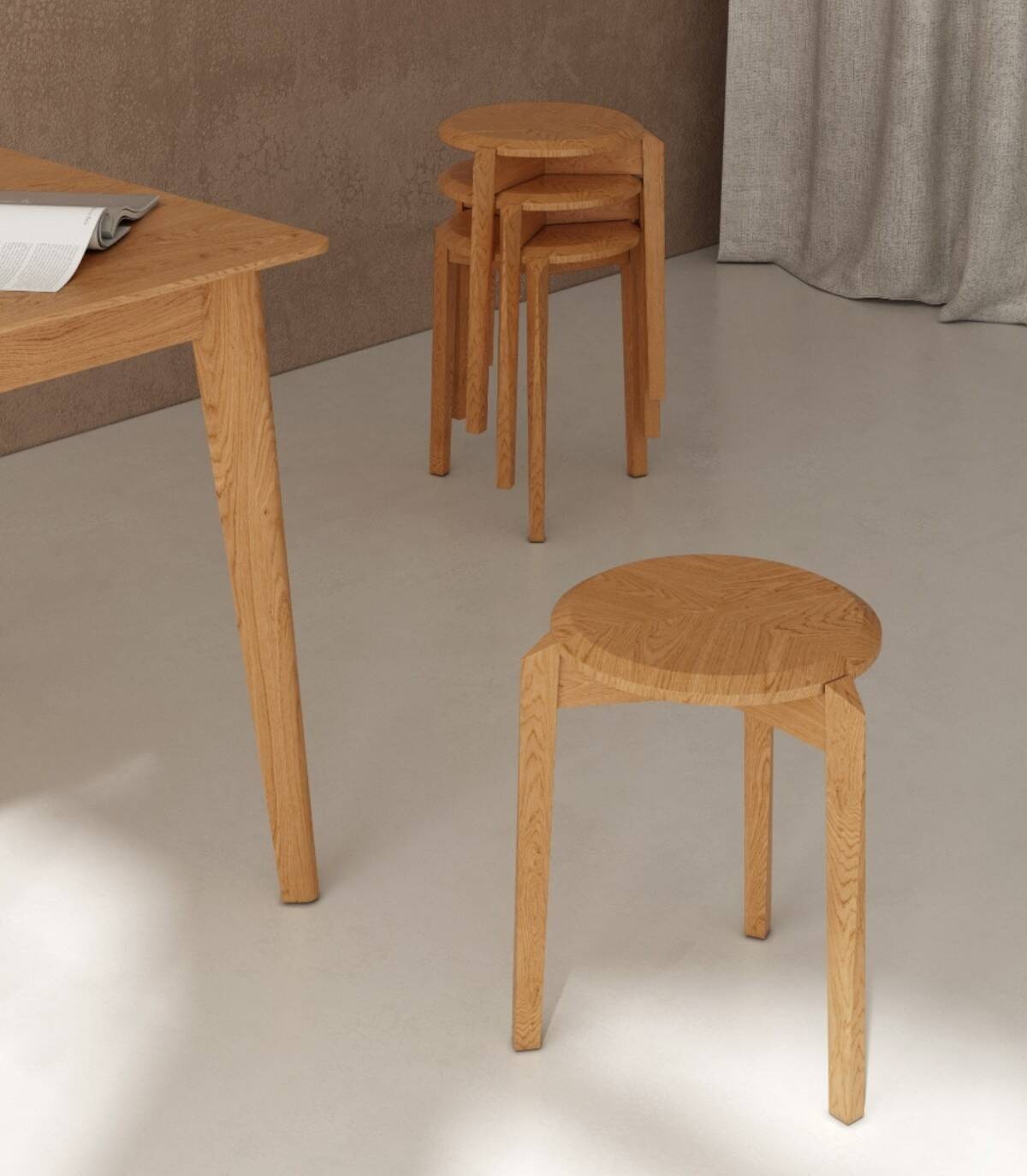 El taburete Olea de comedor apilable se compone de asiento y tres patas de madera de color roble natural.
